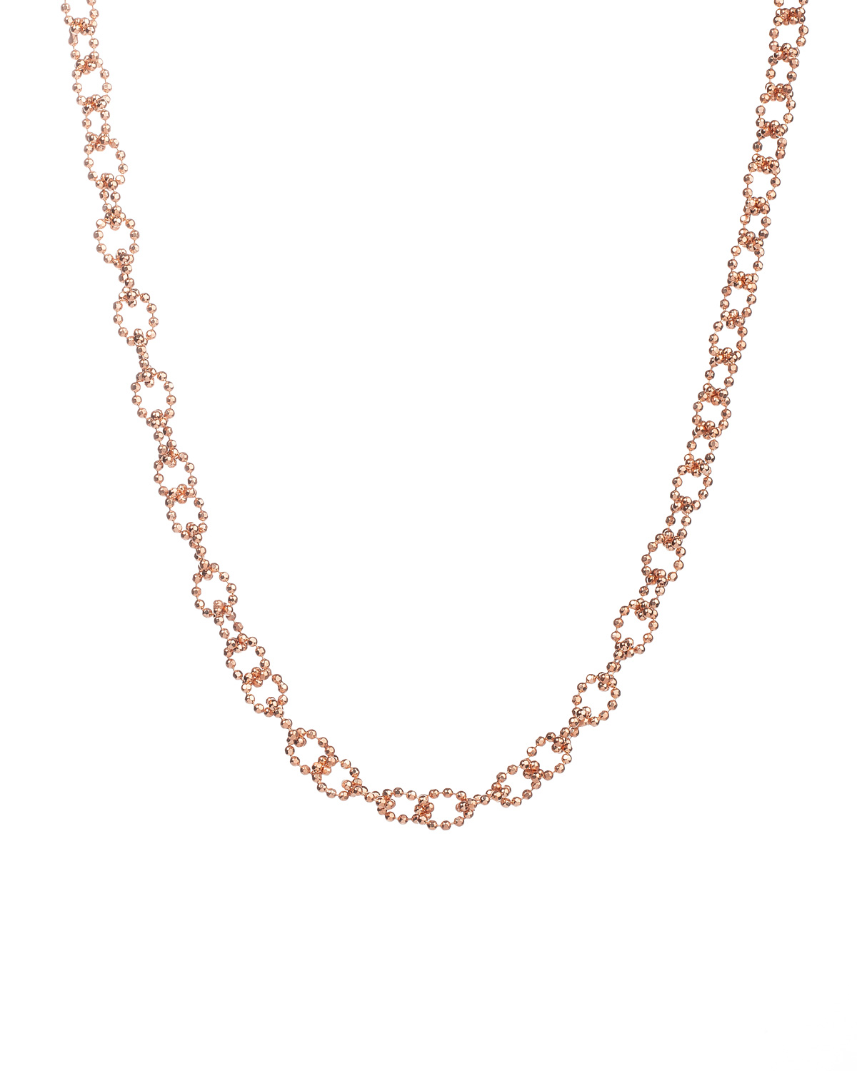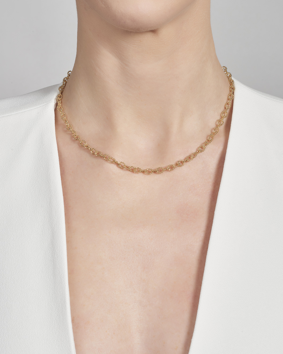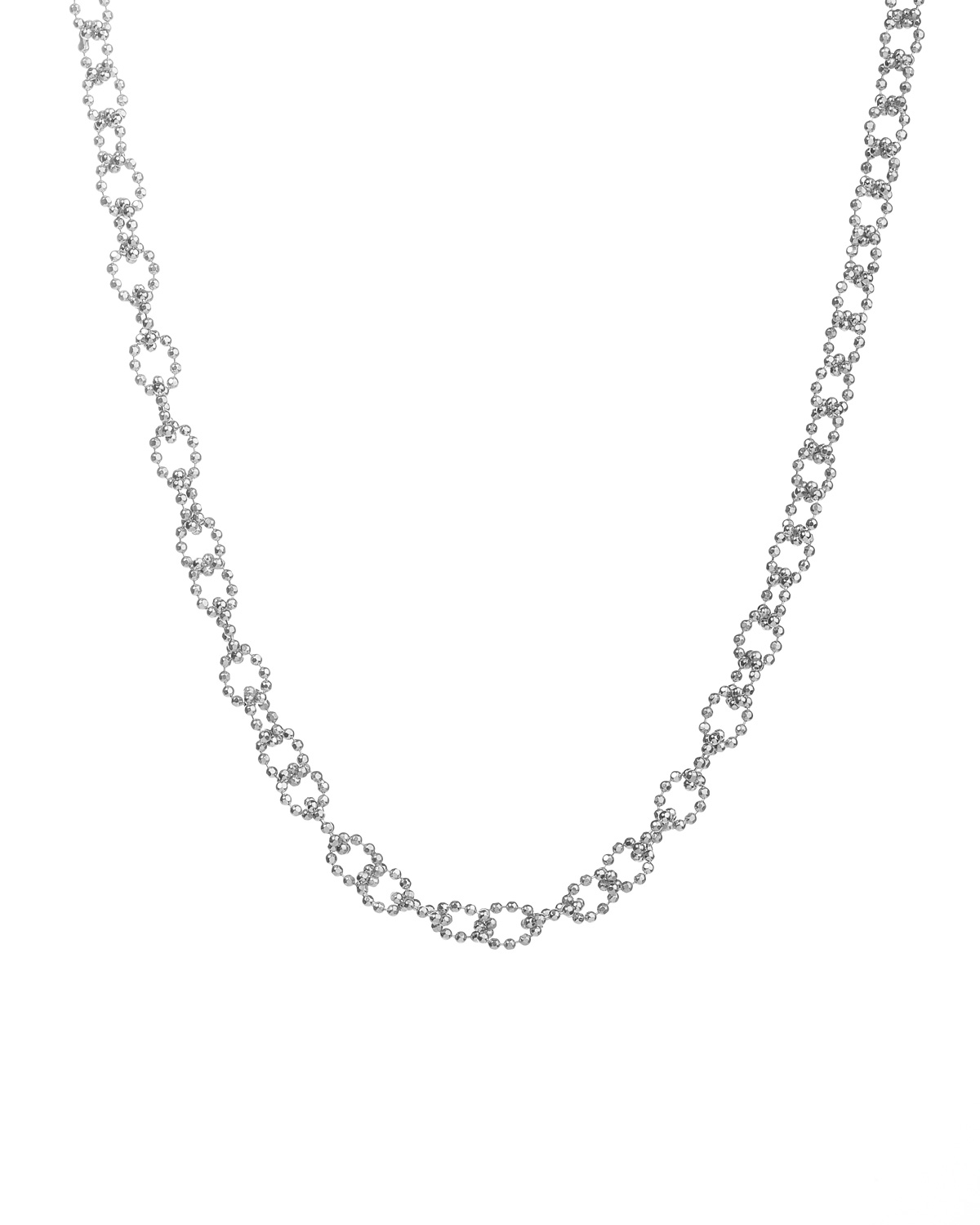 Viene utilizzata la caratteristica catena a sfere sfaccettate per creare una collezione sofisticata e iconica. Per rendere uniforme la trama di sfere sfaccettate viene eseguito un importante lavoro manuale di incastro.